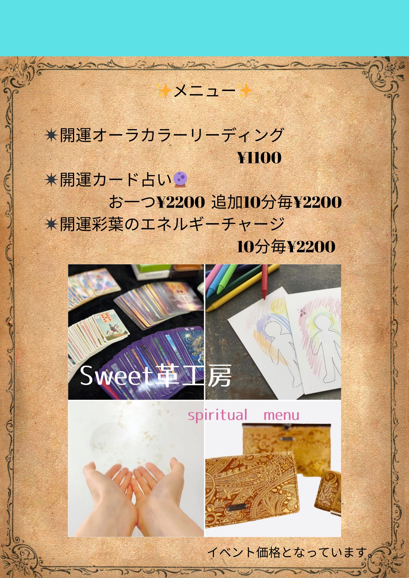 ✨メニュー✨ ✴︎開運オーラカラーリーディング ¥1100 ✴︎開運カード占い🔮 お一つ¥2200 追加10分毎¥2200 ✴︎開運彩葉のエネルギーチャージ 10分毎¥2200 – 1